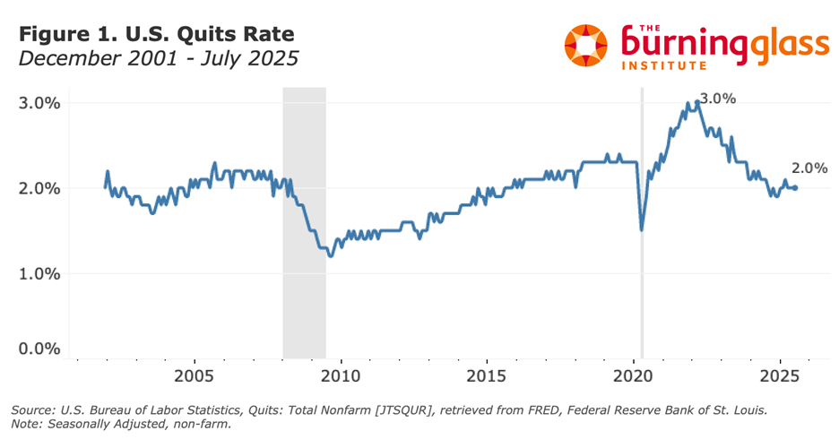 As Figure 1 shows, resignations among workers rose steadily during the 2010 through 2019 period, dropped sharply during the COVID recession, before rising sharply and peaking in March 2022 in the period dubbed the ‘Great Resignation’. Since then, the quits rate has dropped steadily before stabilizing somewhat in 2025.