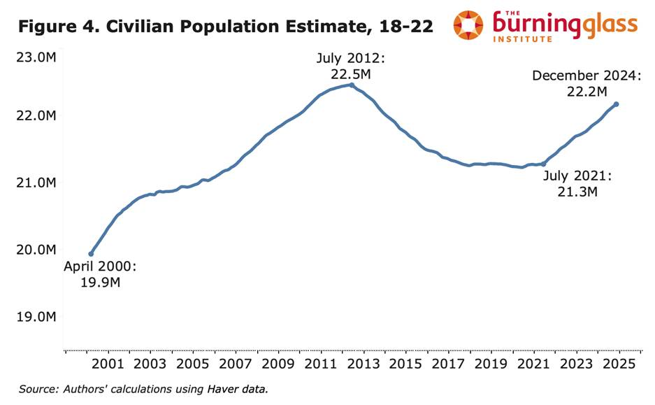 The rebound you see after 2022 is largely explained by the surge in undocumentedimmigration. But since these young people are much less likely to enroll in college, the growth in headcount doesn’t necessarily translate into higher college enrollment.
