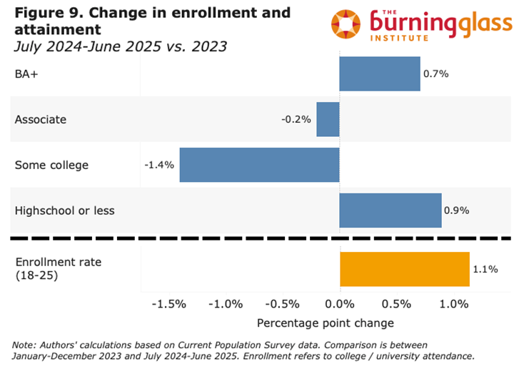 Recent data through mid-2025 show a modest post-2023 rebound in enrollment among 18–25-year-olds. Degree attainment continues to inch upward for those with a BA or higher—even as the share with only a high school diploma has also risen slightly. Meanwhile, the “some college, no degree” category has fallen further, suggesting that more students are completing what they start, and fewer are dropping out midstream.